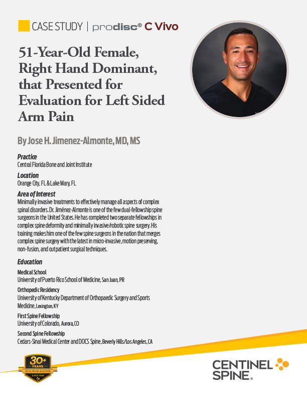 First, Orthopedic Surgeon Dr. Jose H. Jimenez-Almonte, of Central Florida Bone and Joint Institute, Orange City, FL discusses a 51-year-old right-hand dominant female patient who presented for evaluation for left-sided arm pain. In assessing the patient, the Florida spine surgeon noted she presented with left arm pain & neck pain affecting many of her activities of daily life. Imaging findings revealed disc degeneration at C5-C6 with significant central stenosis and bilateral foraminal stenosis with no signs of instability, retrolisthesis, or anterolisthesis.