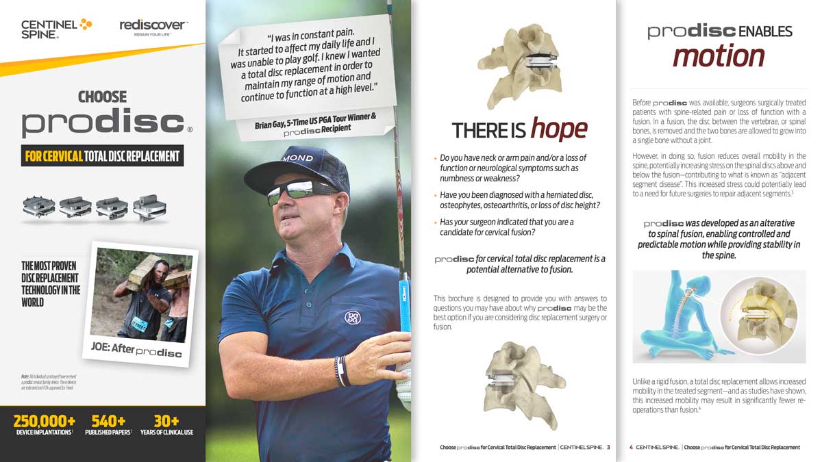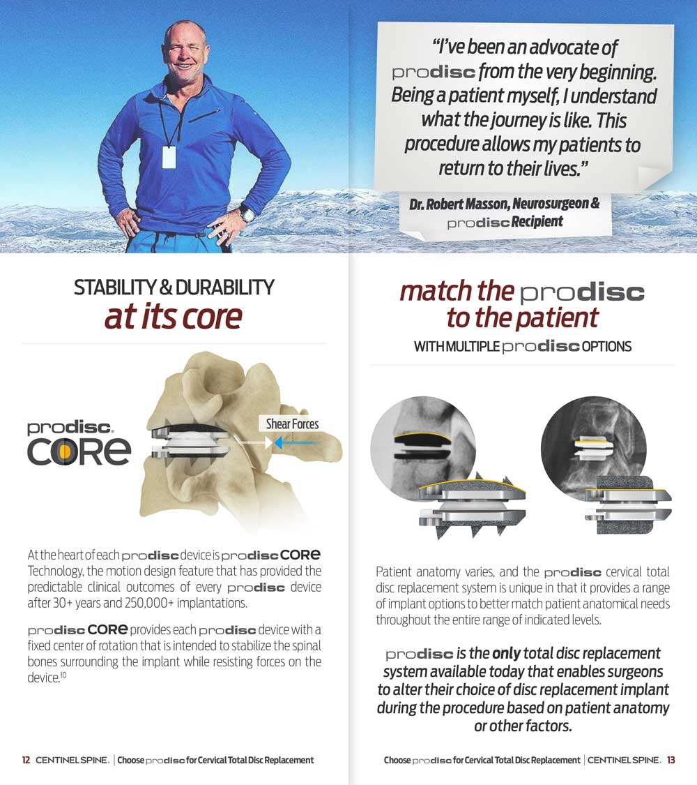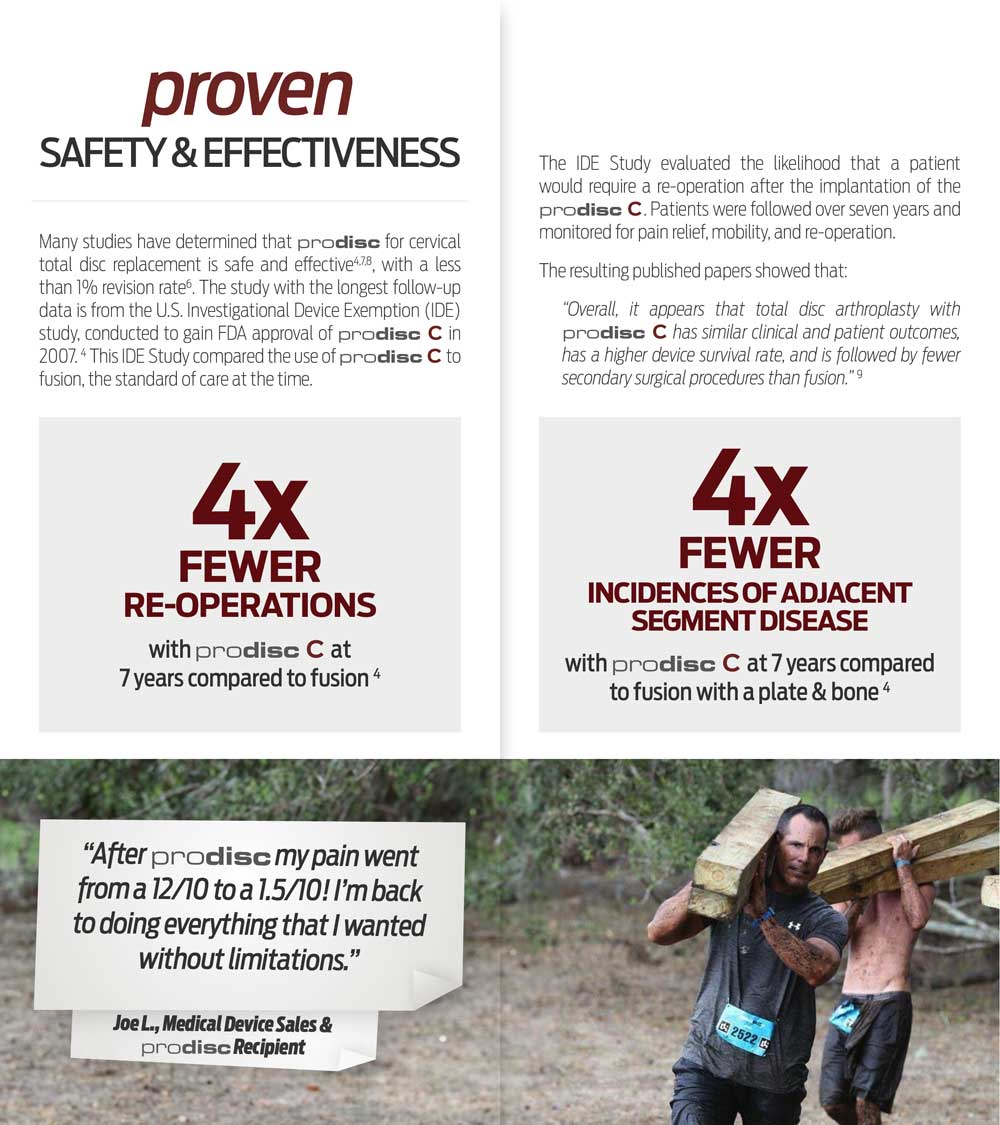 Most importantly, the brochure continues to present real-life testimonials from prodisc cervical patients and findings from the industry-leading 540+ peer-reviewed studies—helping to educate patients about the many unique differentiators between prodisc and other disc replacement options.