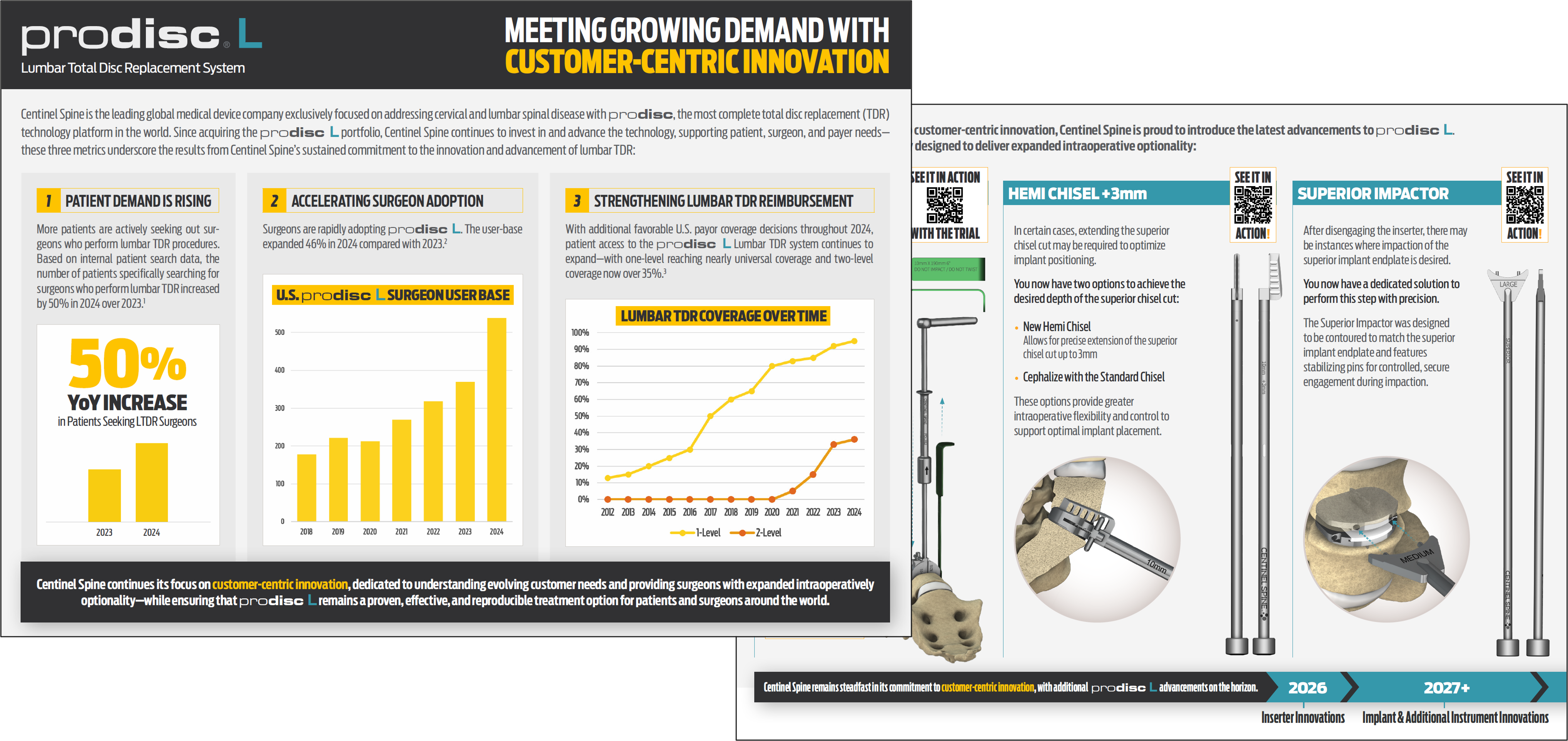 A one-page sell sheet highlighting the increasing demand for lumbar total disc replacement and Centinel Spine's customer-centric innovations in response—beginning with the Strut, Hemi Chisel +3mm, and the Superior Impactor.